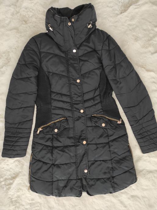 Topla črna zimska bunda, velikost 38. Zapenjanje na zadrgo in pritiskače. Okrašena z zlatimi zadrgami ob straneh, na žepih in rokavih – elegantna in hkrati praktična. Odlično ohranjena.