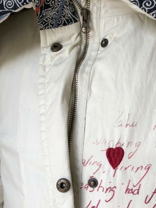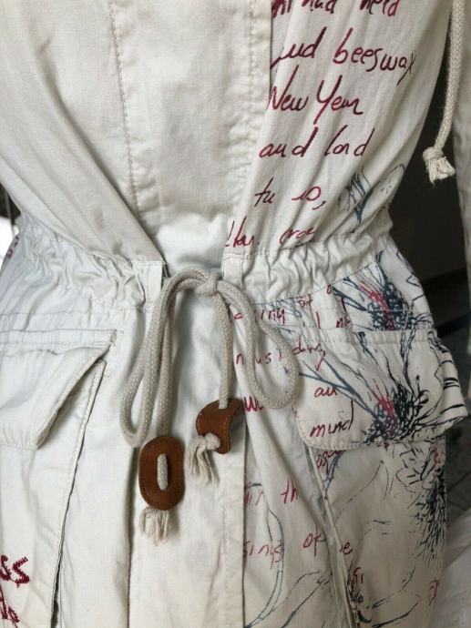 Zelo lepo ohranjena, ni zimska, brez madežev, je podložena z malo debelejšo podlogo, ki se sname z zadrgo, od ene pazduhe do druge meri 49cm, dolžina je 80cm, dolžina rokava od pazduhe navzdol je 19cm
