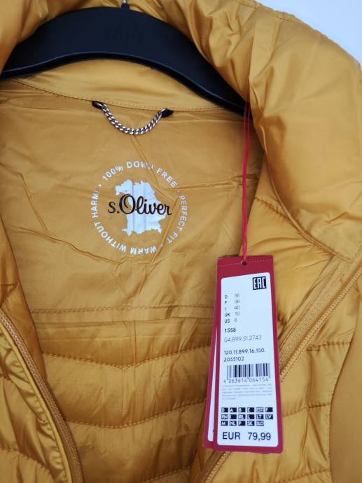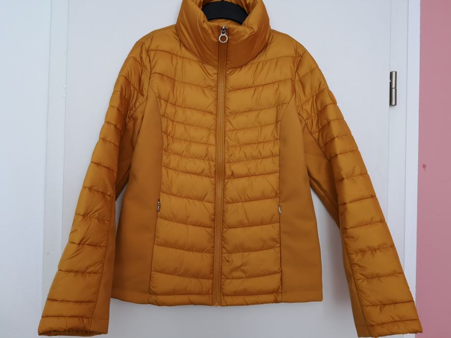 Mehka tanjša prešita bundica, ob strani in po notranji strani rokavov kot softshell, krasne oker barve (bolj žive, kot na slikah).