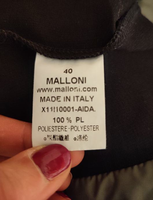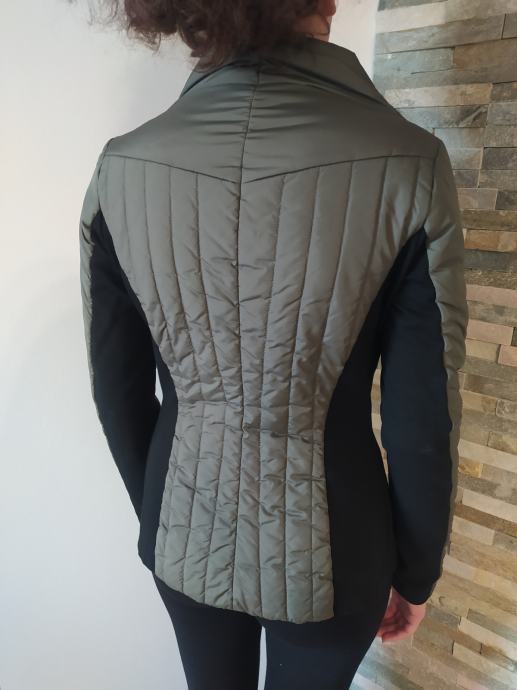 Ženska prehodna jakna v črno in vojaško zeleni barvi, znamke Malloni, kupljena v Italiji. Velikost 40 (italijanska) primerna za XS - 34, hrbtna dolžina 62 cm, hrbtna širina 38 cm, širina čez prsa 46 cm. Material 100 % poliester. Jakna se zapira na večje pritiskače, ima dva zunanja žepa.