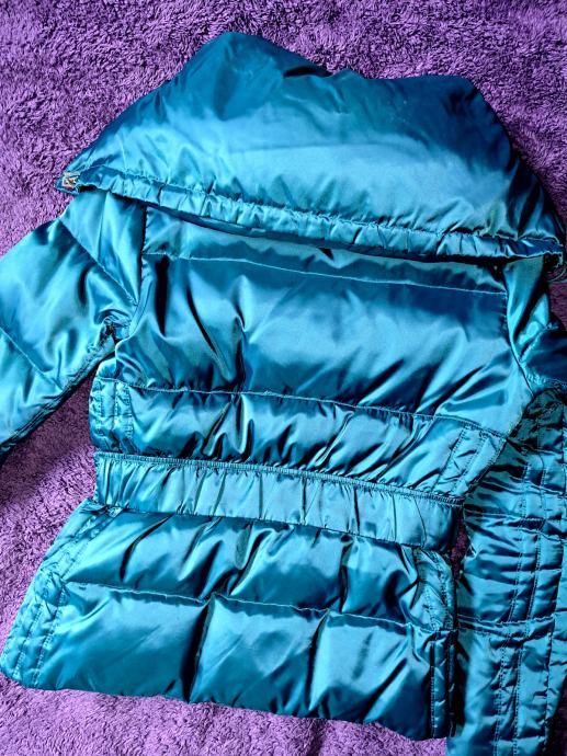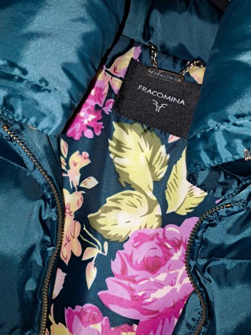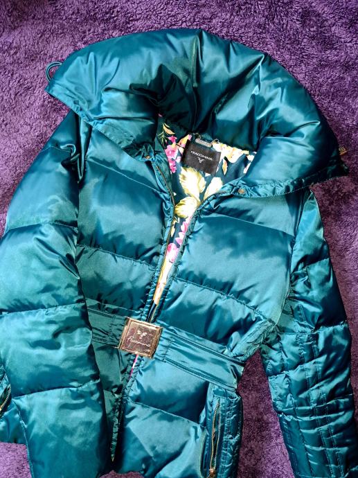 Topla krajša bundica Fracomina v petrolej zeleni barvi iz mešanice puha in perja. Ima dvosmerno zadrgo in fiksen pas v zlati barvi. Ovratnik se lahko zapne, da je višji ali spusti. Velikost je sicer M, primerna pa je bolj za S. Je rabljena, ampak super ohranjena!