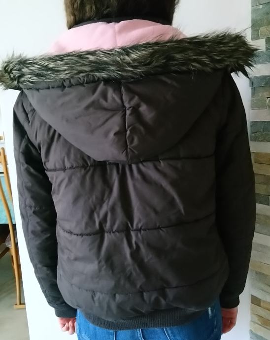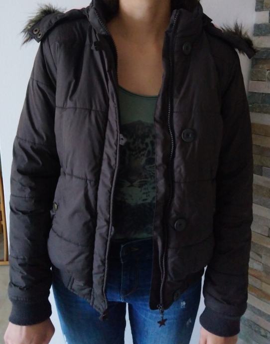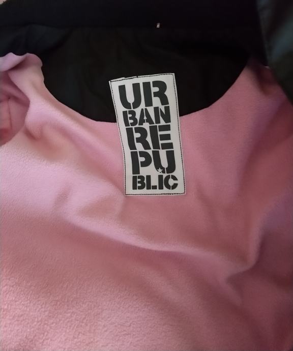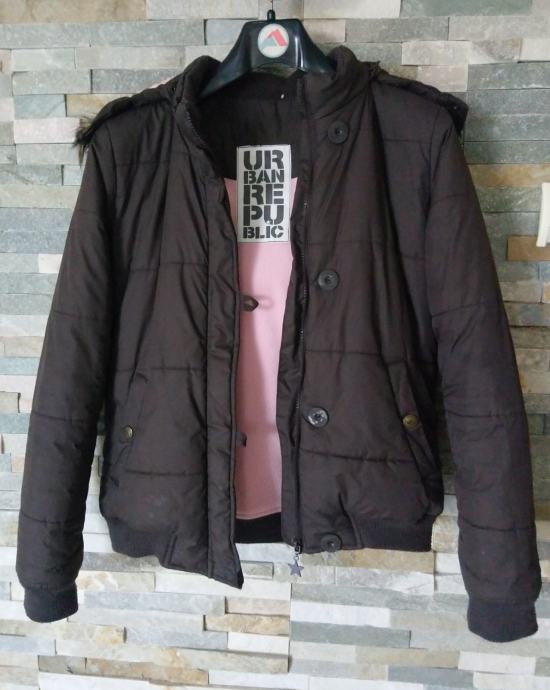 Ženska krajša zimska bunda s snemljivo kapuco v rjavi barvi, znamke Urban Republic. Bunda je toplo podložena s flisom v roza barvi. Na kapuci je umetno krzno. Bunda je spodaj in na rokavih zaključena s patentom, ima en notranji žep in dva stranska žepa na sprednji strani. Zapira se na zadrgo in dodatnimi gumbi. Velikost S. Dolžina bunde je 59 cm, širina prsnega dela 52 cm, dolžina rokava (od rame oz. zunanji rob) je 62 cm. Material: 100 % poliester.