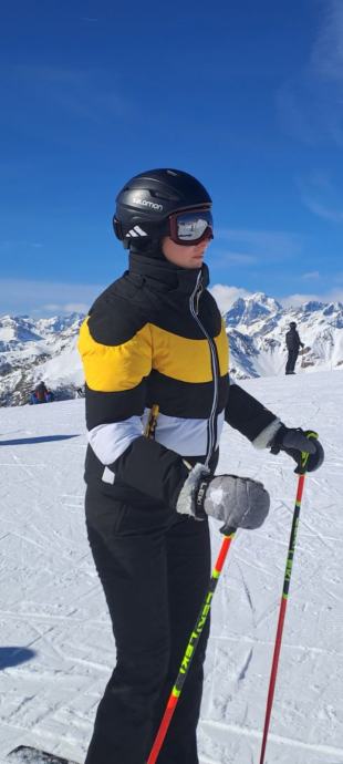 Je zelo topla, ima visok ovratnik proti vetru, snemljivo kapuco ter naramnice na notranji strani.