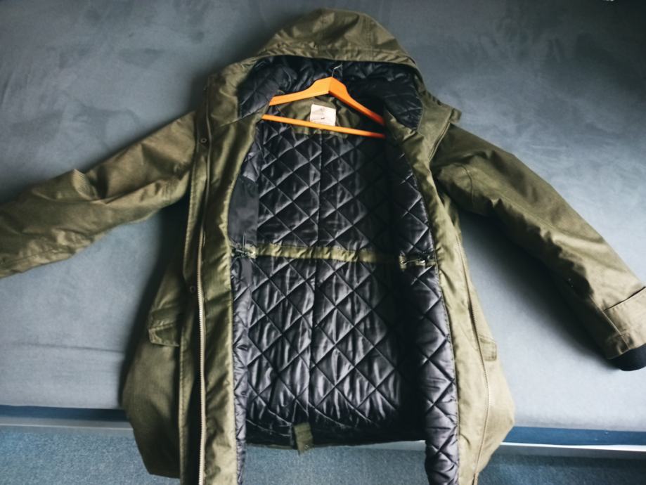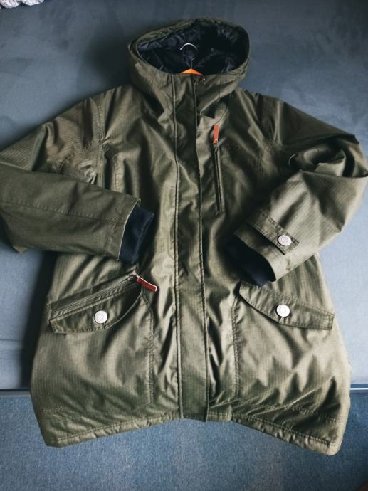 Temno zelene barve, vodoodbojna zaščita 5000, v pasu se lahko zategne. Super ohranjeno, samo parkrat oblečeno. Lahko se pere v stroju.