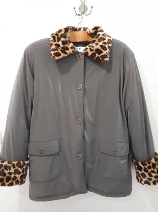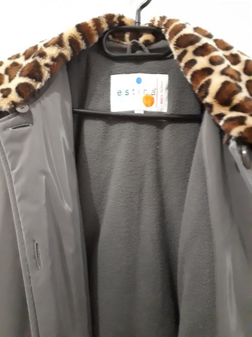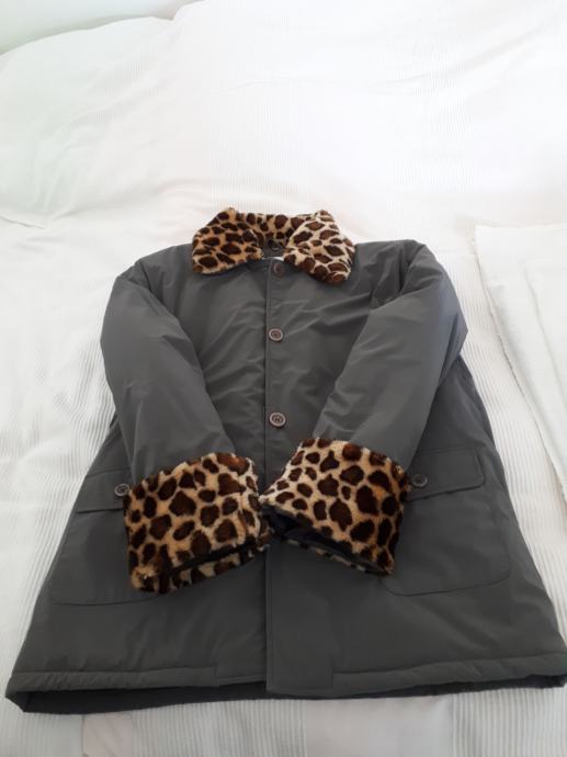 Izredno ohranjena, srebrno-siva, na gumbe in s snemljivim ovratnikom in dodatki na rokavih. Pralna v stroju.