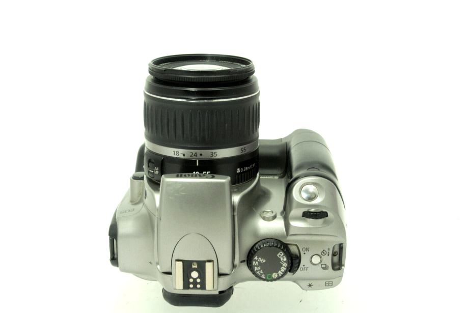 Ta digitalni zrcalno-refleksni fotoaparat Canon EOS 300D je opremljen z objektivom EFS 18-55 mm.