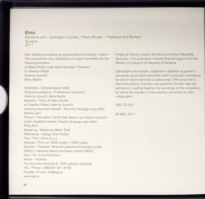 Šatulja in dva CD ploščka v žepku in brošuro 96 strani, formata 135 x 125 mm
