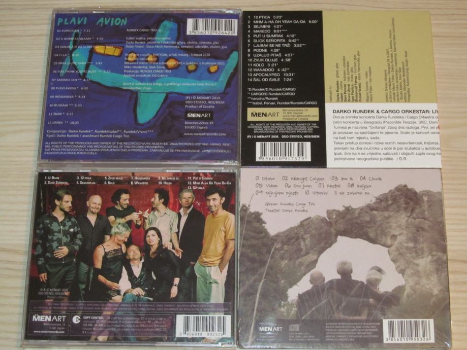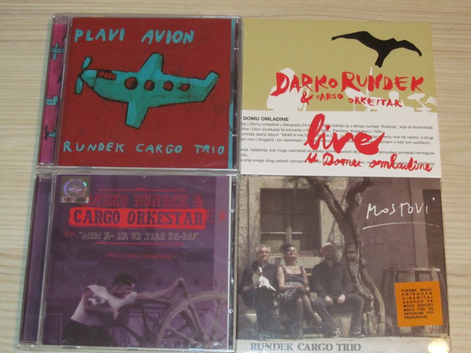Prodam dva cd-ja skupine Darko Rundek & Cargo Orkestar (Live u Domu omladine ter Mhm A-ha Oh Yeah Da-Da!) in še dva skupine Rundek Cargo Trio (Plavi avion ter Mostovi). Gre seveda za skupini Darka Rundeka (ex Haustor). Vsi cd-ji so povsem novi, še v zaščitni foliji