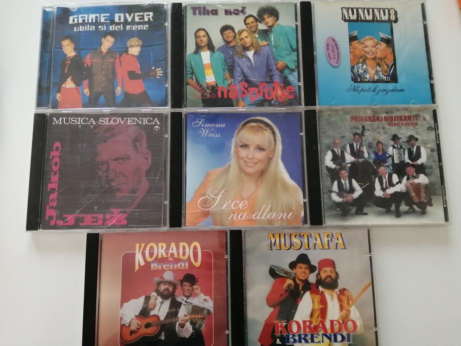 Prodam odlično ohranjene CD-je na sliki. Posamezen cca 10 €.12 NASPROTJE,SIMONA WEISS,KORADO & BRENDI,NAJ NAJ,JAKOB JEŽ...GAME OVER,PRIFARSKI MUZIKANTJE