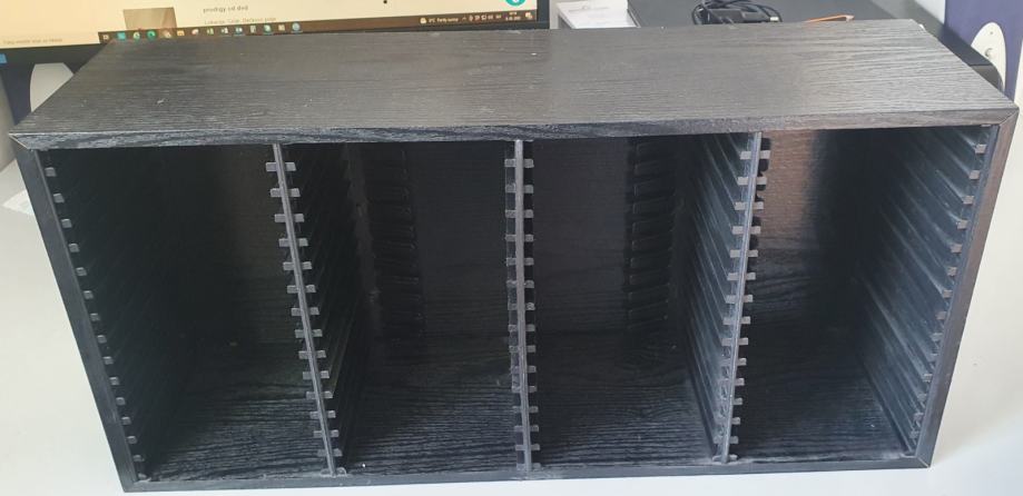 Prodam leseno stojalo / mini omaro za CD in DVD medije ter ostale zgoščenke. Stojalo je iz črnega lesa, kompaktno in ima 60 rež za medije ter je dimenzije 54cm x 26cm x 16cm (d x v x š).