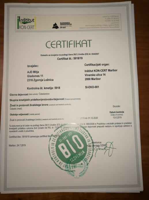 Prodajam ekološki med s certifikatom. Čebele so tretitane samo na ekoloških zdravilih, s tem se v medu in ostalih čebeljih proizvodih ne kopičijo nikakršne karcogene snovi.