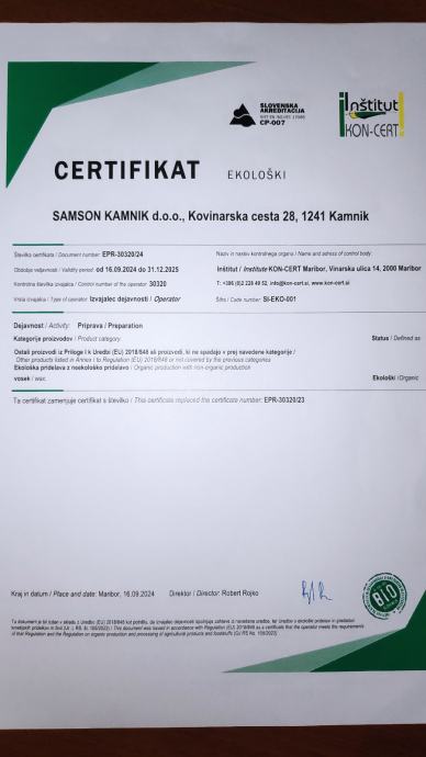 - Kakovost je moja prioriteta! Sem proti uporabi pesticidov, zato so vse satne osnove ekološke z uradnim certifikatom (dokaz na fotografiji).