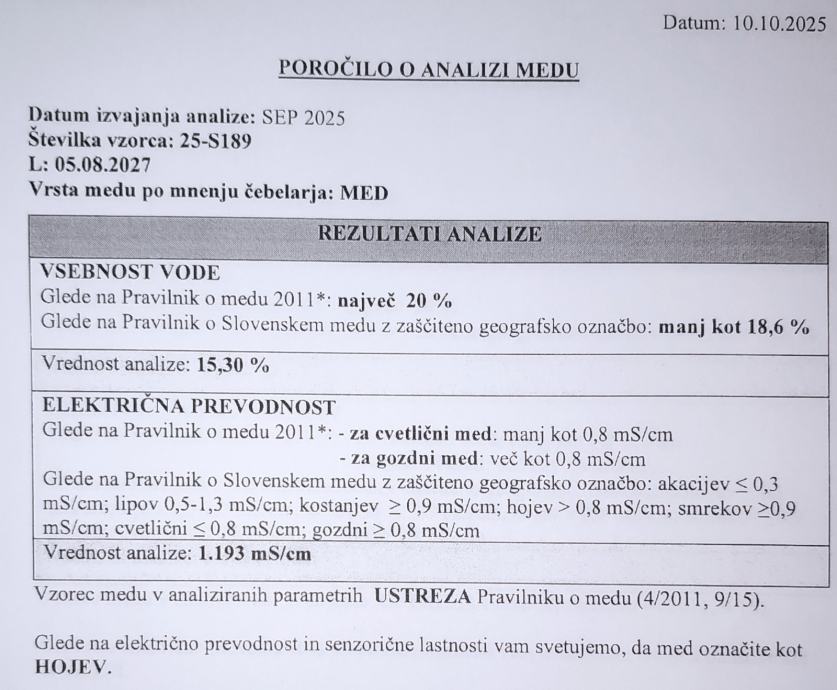 - Med je bil analiziran pri Čebelarski zvezi Slovenije (ČZS): vsebnost vode le 15,60 %, kar popolnoma ustreza Pravilniku o medu (priložena fotografija analize).