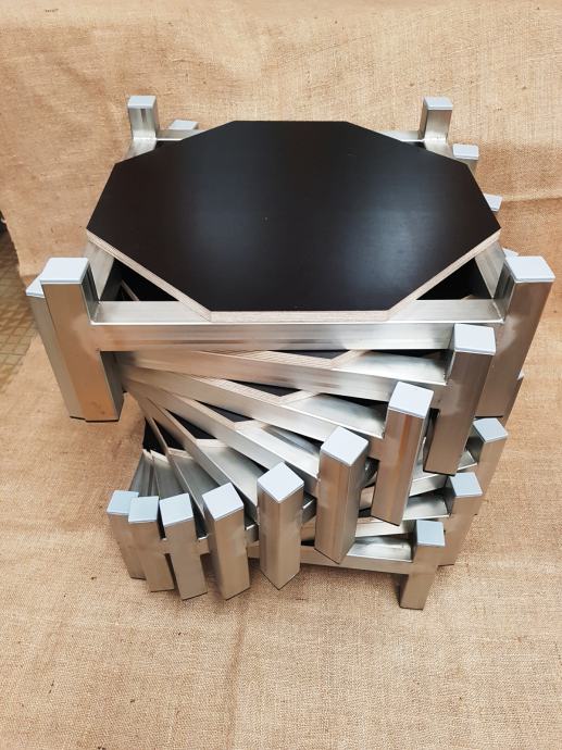 Palete so izdelane iz inox cevi 40mm/40mm in jih je možno premikati z ročnim viličarjem, cena palete je 70,00 €/kom. Možnost prodaje tudi posameznega podstavka