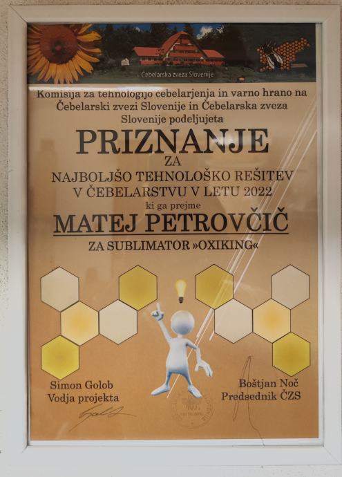 Sublimator je prejev priznanje čebelarske zveze za eno od najboljših tehnoloških rešitev v čebelarstvu za leto 2022.