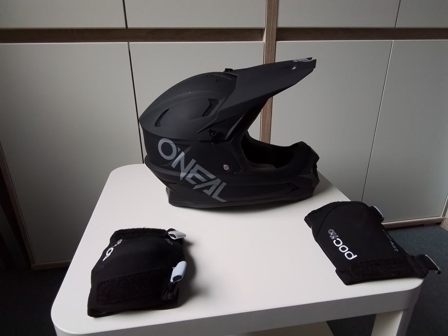 Čelada je praktično nova, na glavi je bila manj kot 1 uro. Prav tako ščitniki. Velikost razvidna iz slik. Cena je za komplet. Lahko tudi posamično.