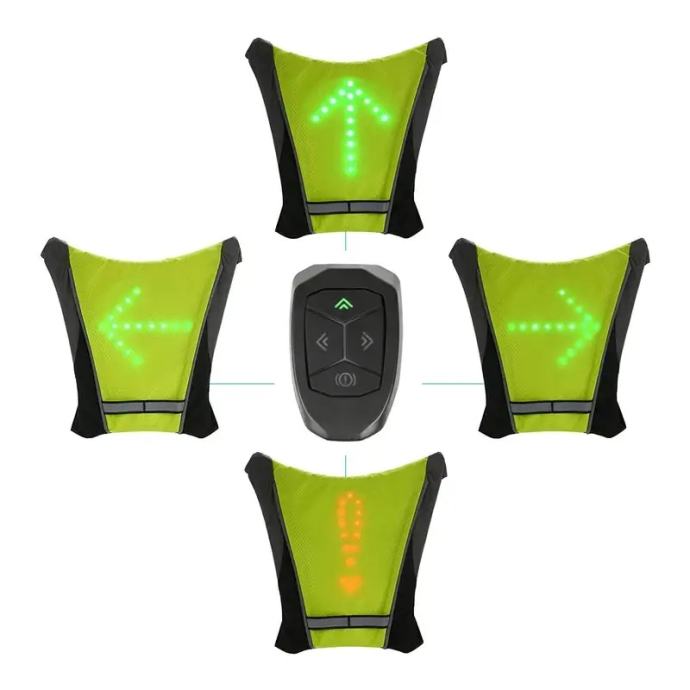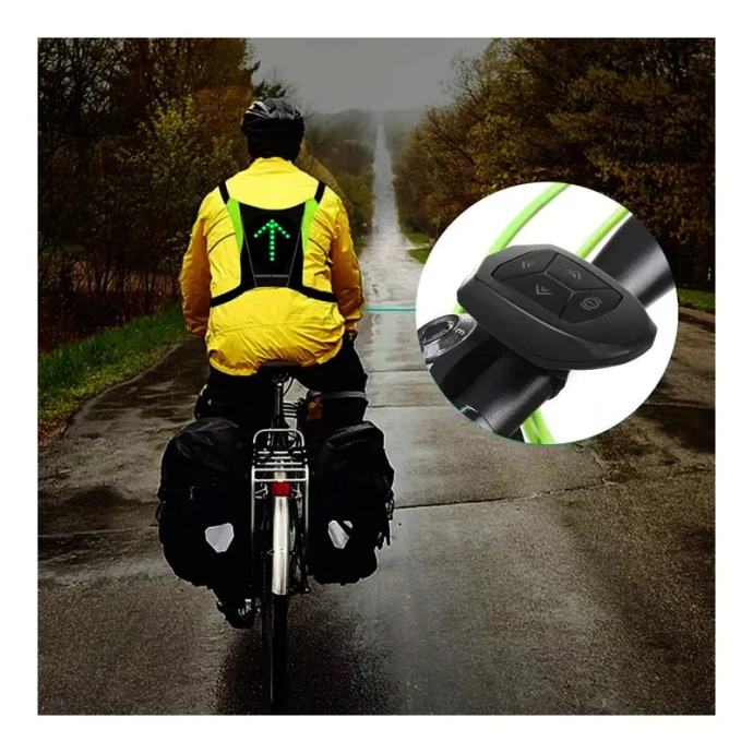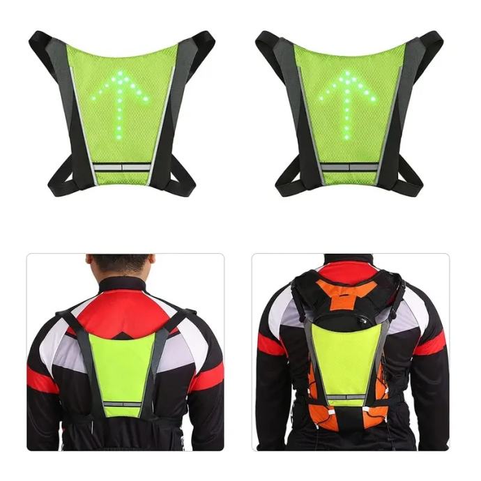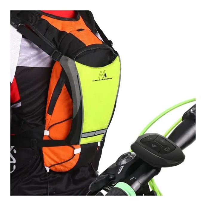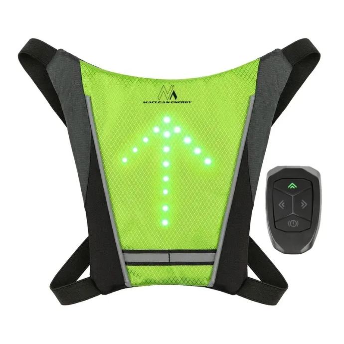 Visokokakovosten odsevni jopič Maclean Energy MCE420 LED. Jopič se upravlja z brezžičnim daljinskim upravljalnikom in bo prikazal opozorila za zavijanje naprej, levo, desno in zaustavitev, tako da lahko uporabnik prikaže opozorila (za ljudi zadaj ali avtomobile). Zelo uporaben je za kolesarjenje, plezanje, pohodništvo in druge športe na prostem.