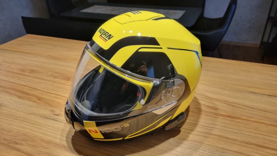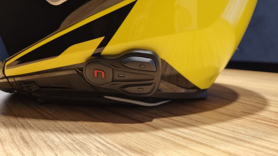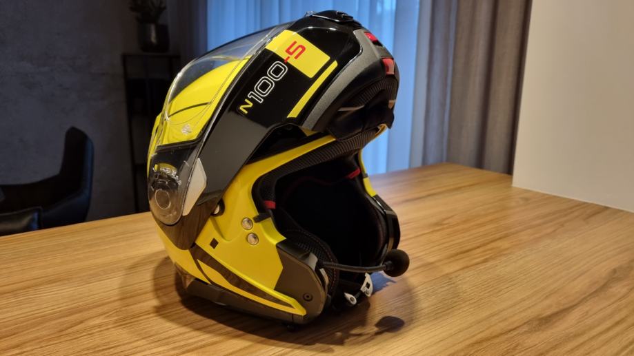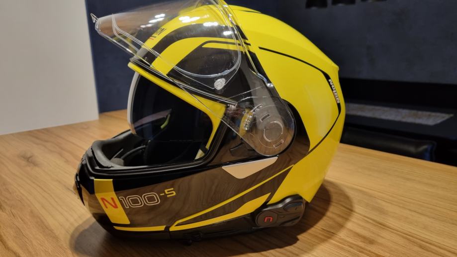 Preklopna čelada, izčiščenih linij, naprednih tehničnih rešitev in maksimalne stopnje zaščite. Idealna za turistični motociklizem. Obrazni del z eliptično krožnico, vizir z neobičajno velikim vidnim poljem, stopenjsko nastavljiva sončna zaslonka, natančno prileganje, učinkovito prezračevanje, dvojni zatezni ovratnik, … Vgrajena komunikacija N-COM 601. Velikost S, obseg glave 55-56 cm.