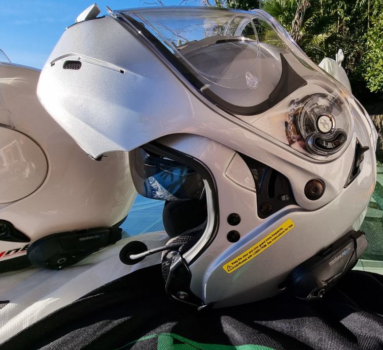 Malo rabljeni, odlično ohranjeni preklopni čeladi z 2x Interphone F5XT za medsebojno komunikacijo s sopotnikom ali z mobilnim telefonom.