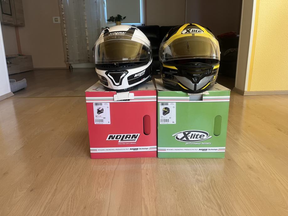 Prodam dve čeladi. Nolan N87 plus velikost S in X-lite x-661 velikost XL, skupaj z kumunikacijama n-com B 601R in B 601X. Čeladi sta dobro ohranjeni, nošeni vedno s podkapo in hranjeni v original vreči.