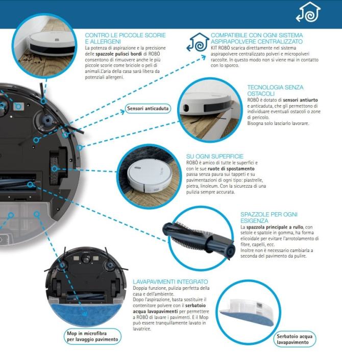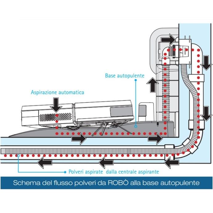 TUBÒ® ROBÒ KTR900LA je edini robotski sesalnik s samodejnim praznjenjem v centralnem sesalnem sistemu. Zaradi te izjemne lastnosti je dragocen in popolnoma avtonomen pomočnik pri čiščenju. Zahvaljujoč samočistilni podlagi s tehnologijo Plug & Play je univerzalen in združljiv z vsemi centralnimi sesalnimi sistemi, ne samo s Tubò by Aertecnica.