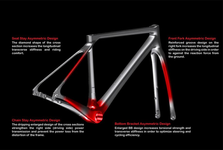 Asimetrična zasnova kolesa - Pogonski sklop na kolesu je seveda na desni strani. Z ojačitvami z najboljšimi materiali na sprednji in zadnji vilici se zagotavlja izjemno trdoto in zmanjšuje deformacijo okvirja pod silo. S tem se zmanjšuje izgubo energije in vložene moči.