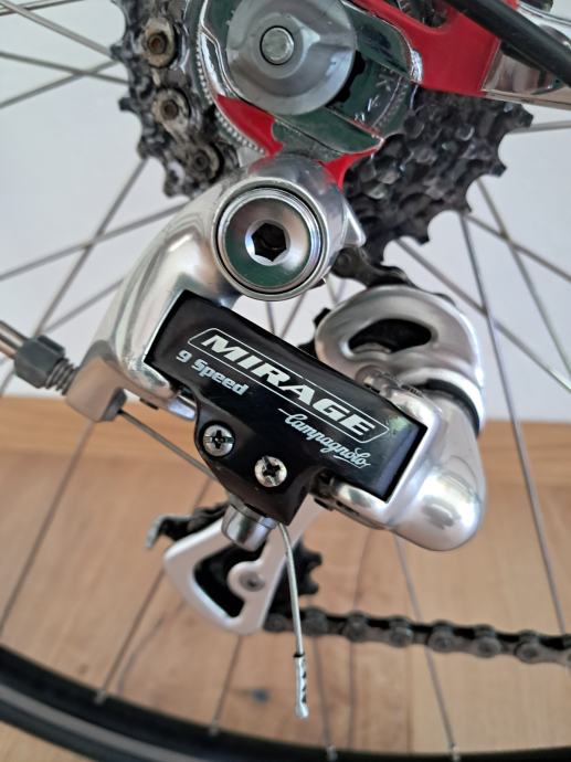 Ima opremo Campagnolo Mirage, ki odlično deluje. Zavore in peste pa so znamke Miche.