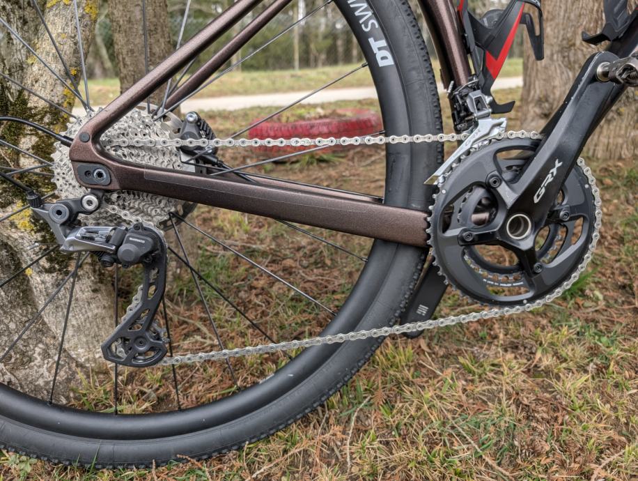 Kolo je opremljeno s Shimano GRX opremo, pogonski sklop 2x11 (31/48 spredaj, 11-34 zadaj).