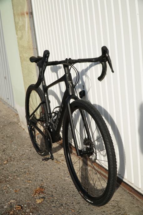 Črne mat barvem, karbonski okvir, Shimano GRX, prestave 2x11, 28" kolesa 700c, tubeless.