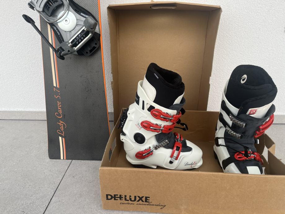 Delluxe Track225T čevlji za alpin board, kot novi, ženski model št.38, skupaj z Alpin board Goltes lady carve 5,7. dolžine 157. Vse skupaj je bilo kupljeno novo in je rabjeno samo par dni na rogli. Prodamo.