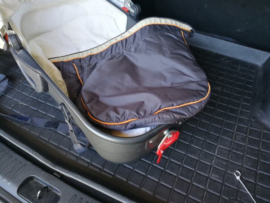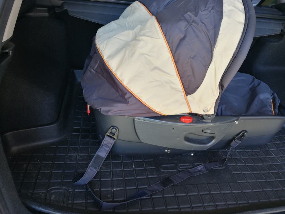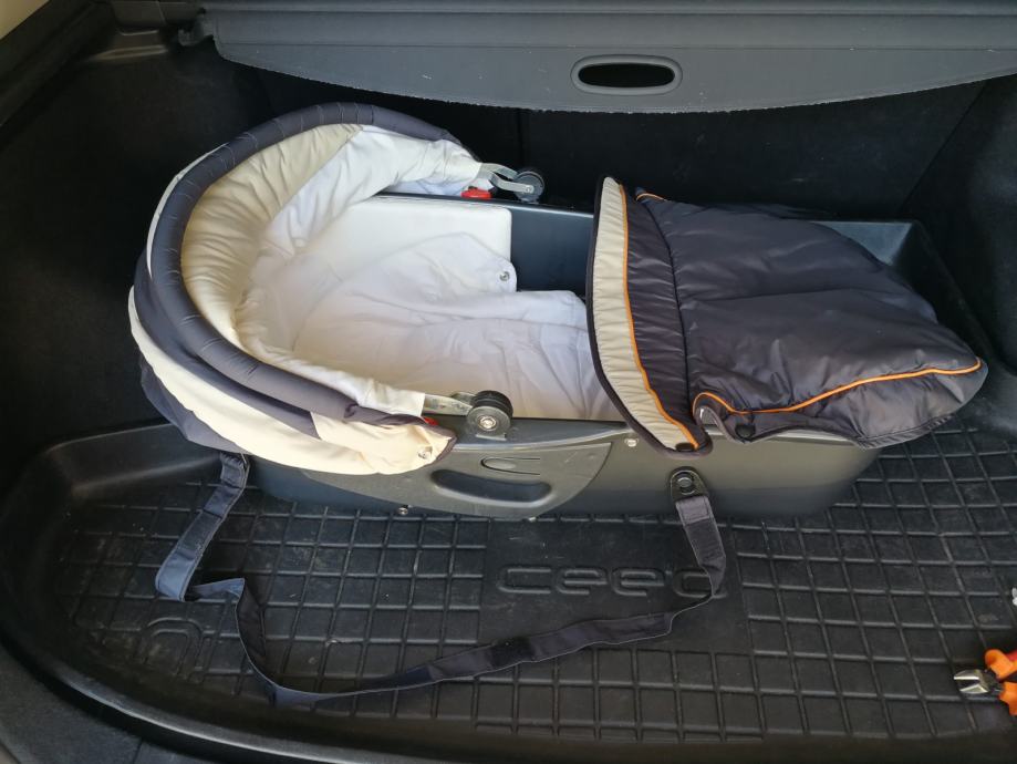 Košara s pasovi in pritrdili za na zadnjo klop v avtu. Bila koriščena za dolge poti 9h in več.
