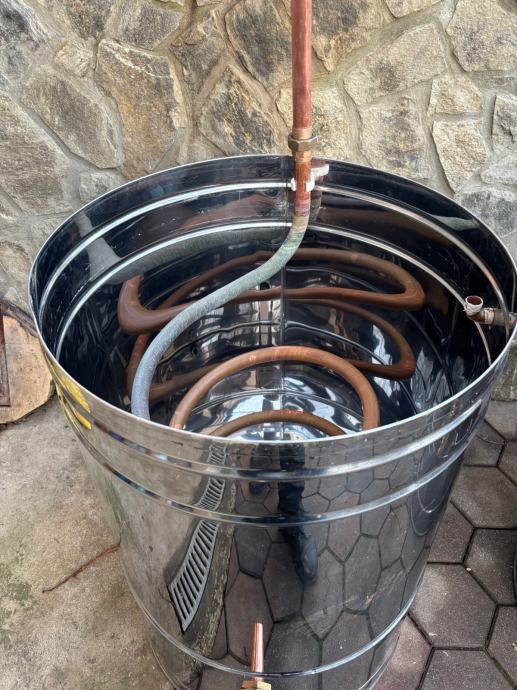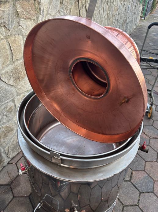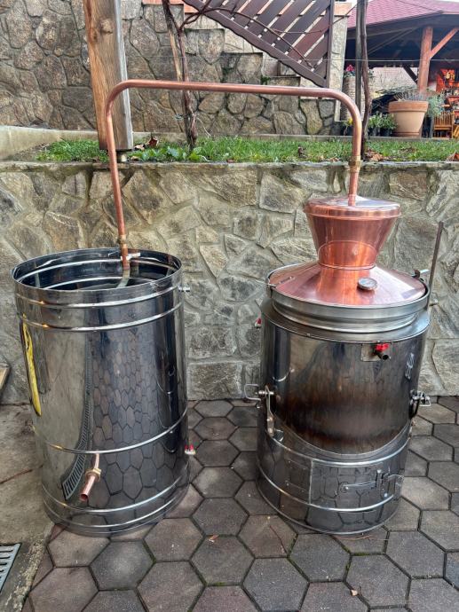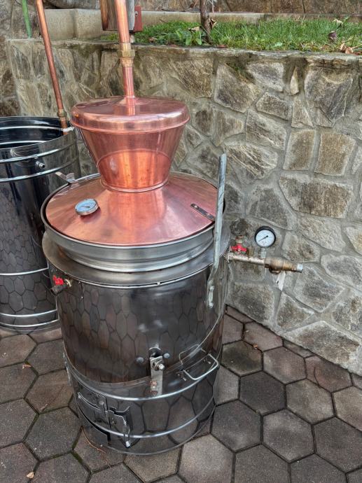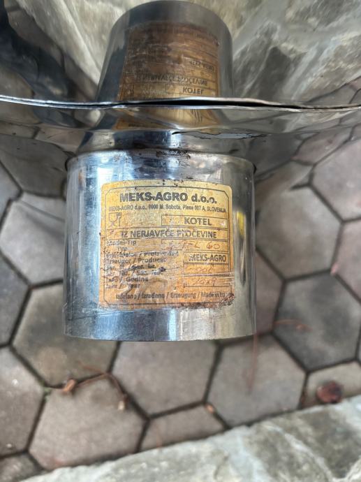 Prodam malo rabljen nagibni kotel za žganjekuho 60l z dvojnim dnom, varnostnim ventilom in hladilnikom. Kotel je bil ogrevan samo s plinom. Dno kurišča ima obloženo s šamotno peko. Kotel je primeren za goste drozge, saj zaradi dvojnega vodnega plašča ne more priti do prismoditve materiala.