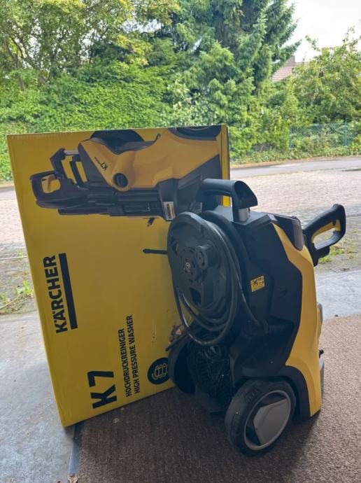 Kärcher K7 Premium – zmogljiv visokotlačni čistilec z dodatki za čiščenje različnih površin in kolutom za cev. V paketu je originalna embalaža in vsa dodatna oprema, kot je prikazano na slikah.