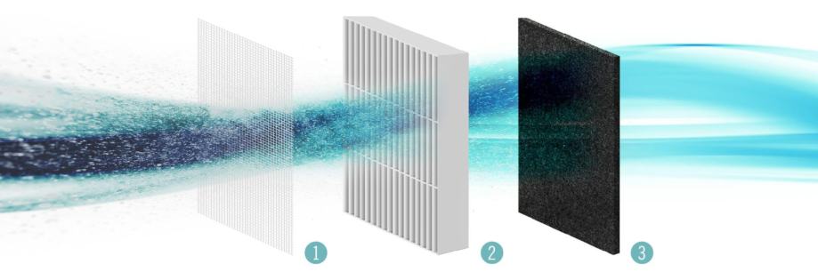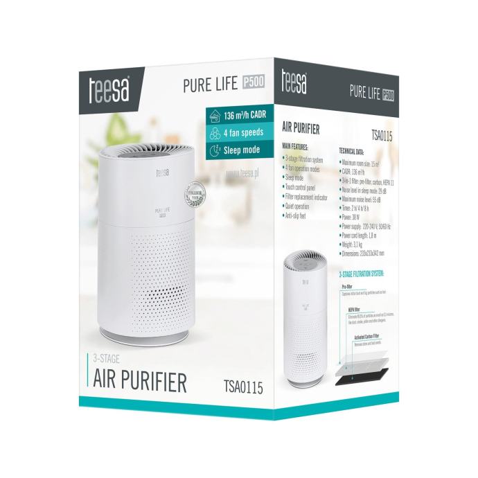 Čistilec Teesa Pure Life P500 uporablja 3-stopenjski filtrirni sistem. Predfilter odstrani večja onesnaževala, na primer prah ali dlake, filter HEPA 11 odstrani do 99,5 % delcev, kot so cvetni prah in drugi alergeni, ogleni filter pa absorbira škodljive pline in odstrani neprijetne vonjave.