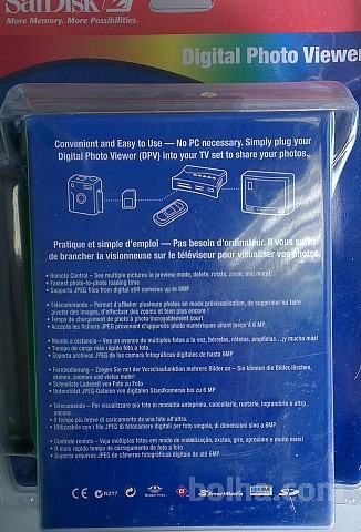Prodam nov in nerabljen SANDISK Digital Photo Viewer, čitalec spominskih kartic (SD, Memory Stick, MultiMedia Card, SmartMedia, CompactFlash I/II) ki se lahko priklopi na TV ali kateri drugi zaslon za ogled slik brez računalnika ali kakšne druge naprave. V kompletu je tudi daljinec.