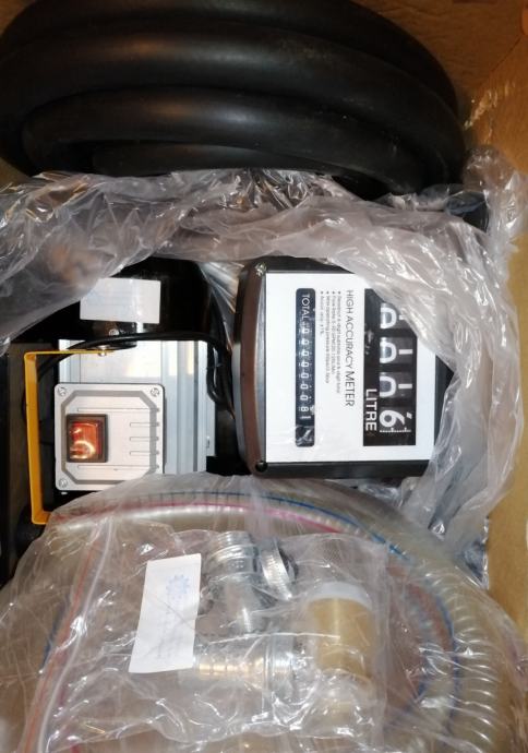 Nova pretočna samosesalna črpalka za gorivo skupaj v kovinskem ohišju z avtomatsko pištolo, analognim števcem in cevjo z navojnimi priključki in objemkami.