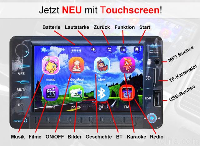 Zvočne funkcije: Bluetooth, FM radio, SD kartica, USB, MP3, VIDEO, AUX