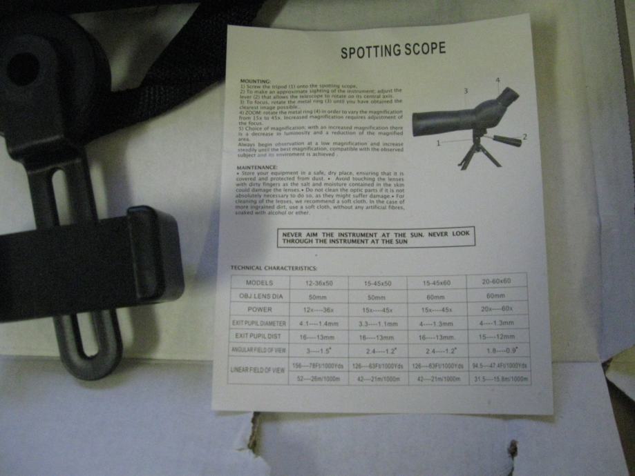 Spektiv je star pol leta in je nerabljen. Podatki 20 - 60 - 60. Ima tudi nosilec za montažo mobitela.