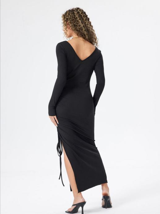 Prodam nikoli nošeno krasno črno daljšo obleko z razporkom, ki se ga (višino) uravnava z vrvico.