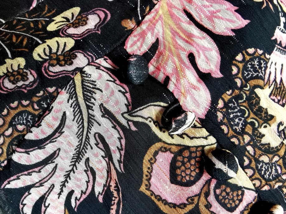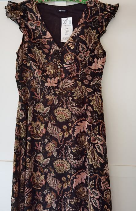 Obleka je nova, zapenja se zadaj z zadrgo, blago se rahlo zlato sveti zaradi posameznih zlatih niti.