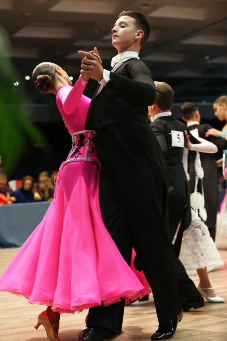 Tekmovalna plesna obleka za standard plese. Obleka je izdelek vrhunske kreatorke plesnih oblek.