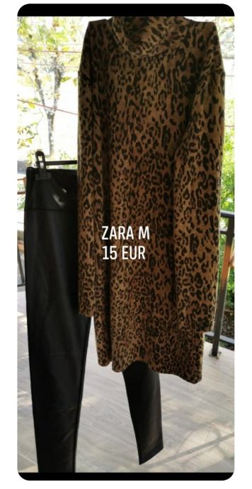 Prodajam pleteno obleko Zara z leopardjim potiskom velikosti M, v rjavi barvi. Obleka ima dolge rokave s puli ovratnikom in je narejena iz bombaža. Rabljena obleka je v odličnem stanju in je idealna za jesensko-zimsko obdobje.