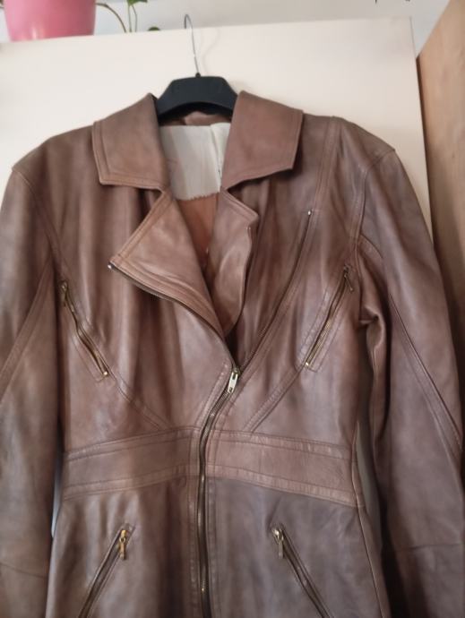lepo ohranjena, pravo zelo mehko usnje, na spodnji strani ima nekaj drobnih pikic, obleki je bila odstranjena podloga (vidno na zadnji sliki), od ene pazduhe do druge meri 49cm, pas je 35,5cm, dolžina je 102cm, ne menjam, ptt ni vključena v ceno