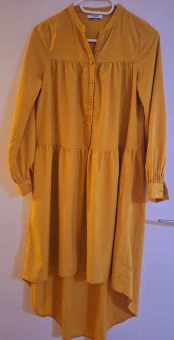 Prodam prelepo srajčno obleko, zadaj daljšo kot sppredaj, v velikosti xs ampak je lahko vse do velikosti M. Super pride tudi čez jeans hlače in superge.