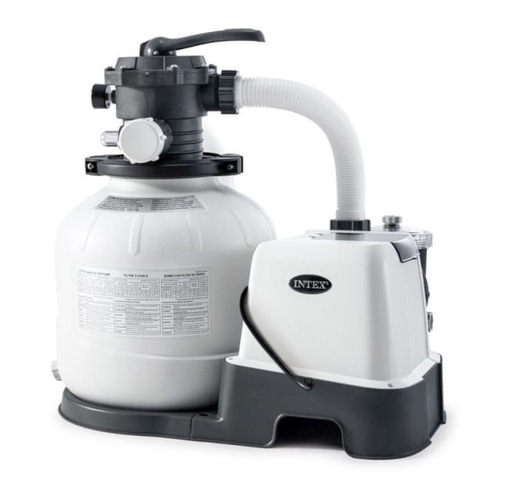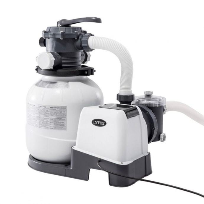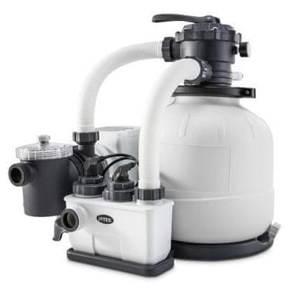 Peščeni filter s črpalko in solinatorjem, znamke Intex. Rezervoar velikosti 360 mm z odpornostjo proti morebitni koroziji. Največji pretok skozi črpalko je 7,9 m3/h, medtem ko za celoten sistem znaša 6 m3/h. Maksimalna kapaciteta je 35 kg. Na voljo v paketu z dvema cevema, premera 38 mm.