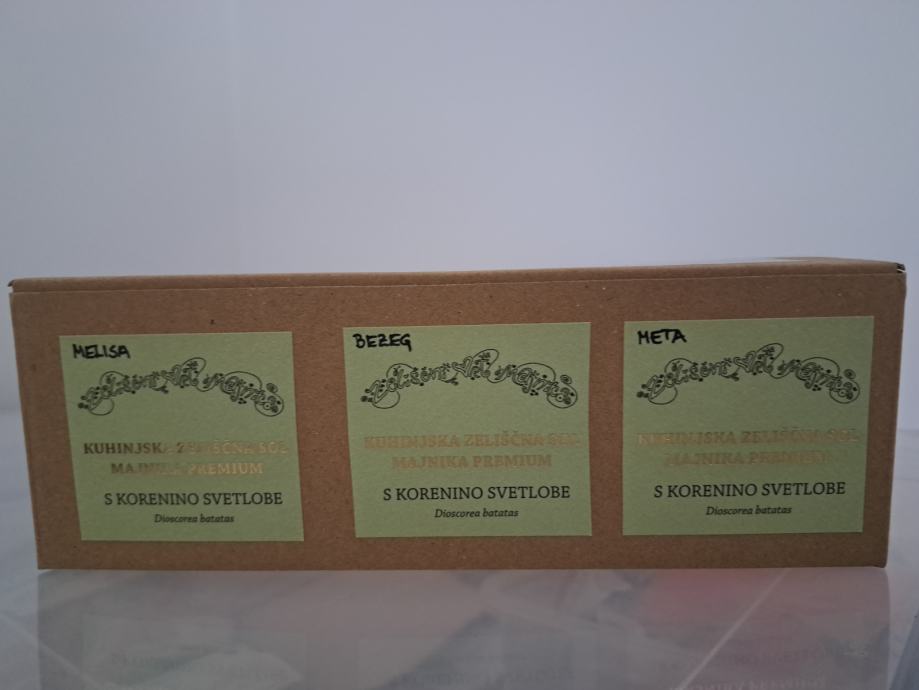 Tri ekološka zelišča v treh skodelicah v darilni škatlici iz Zeliščnega vrta Majnika.
