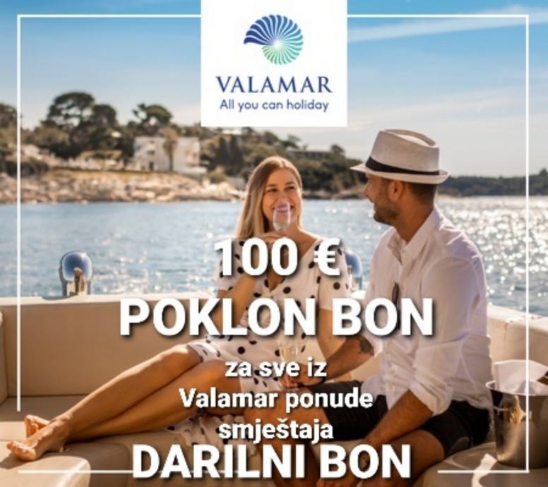 Podarim več darilnih bonov v vrednosti 100 EUR za katerikoli hotel, kamp ali apartma iz Valamarjeve ponudbe (vključno z že znižanimi cenami) POLETJE 2026, ki veljajo za vse skupne cene nad 500 EUR.