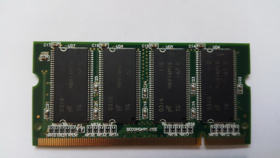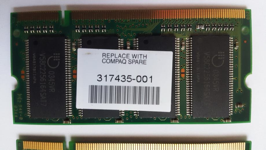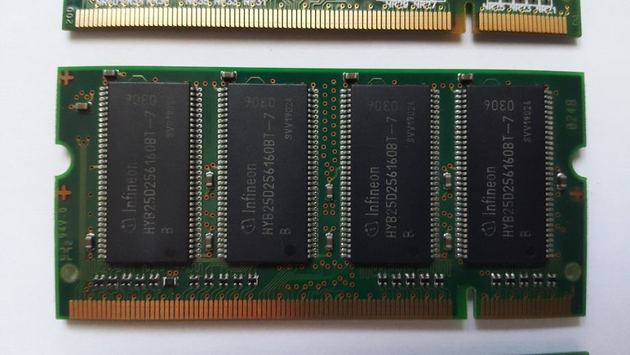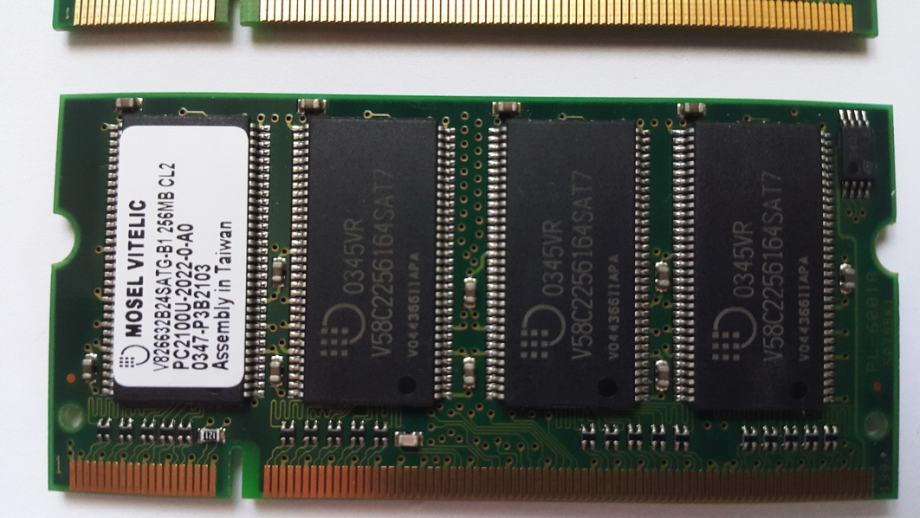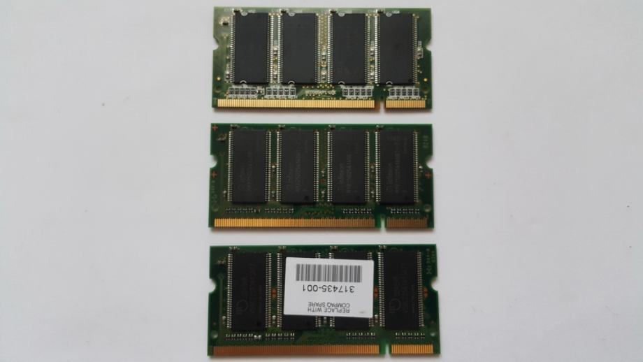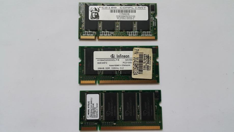 Prodam 3x DDR1 200 pinske 256 MB 266 MHz PC2100 SODIMM modul za starejše prenosne računalnike, različnih modelov. Vsi naj bi veljali za delujoče. Ker so pa starejši, jih pa realno ne morem testirati/preveriti na primernem prenosniku z (npr.) MemTest86 4.3.7 programom, da bi res to preizkusil ali so dejansko brezhibni. Tako da se prodajajo načeloma kot delujoči, vendar pač vrnem denar, če se naknadno ugotovi, da niso.