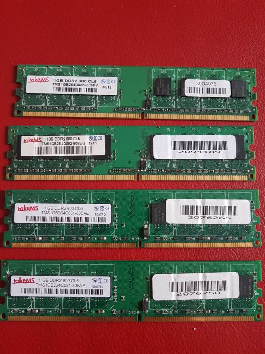 5 kosov pomnilnika 1GB DDR2 800 CL5 proizvajalca takeMS. Cena je za vseh 5 kosov skupaj. Posamezni kos je cena 8,00 EUR/kos.