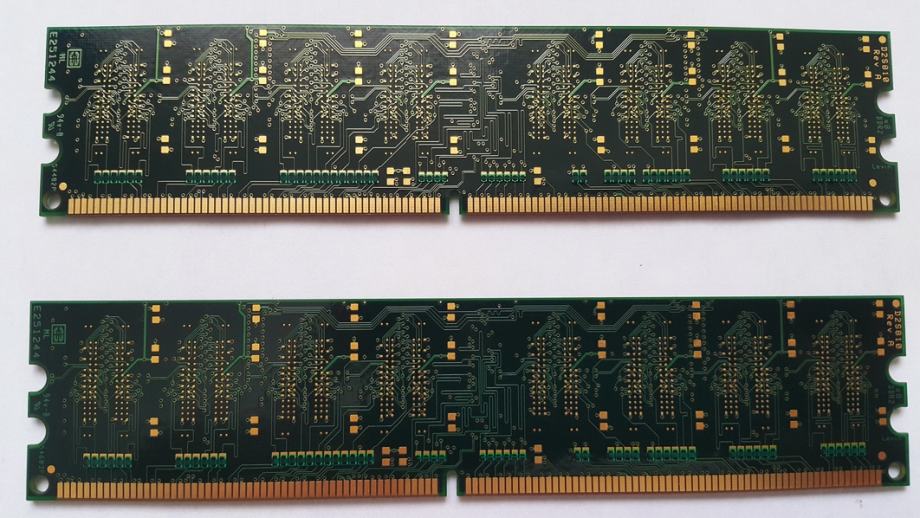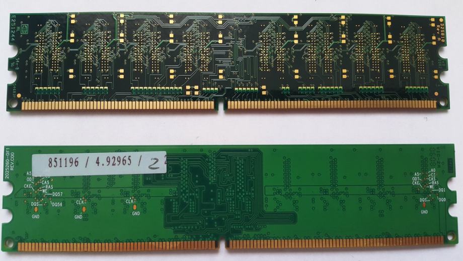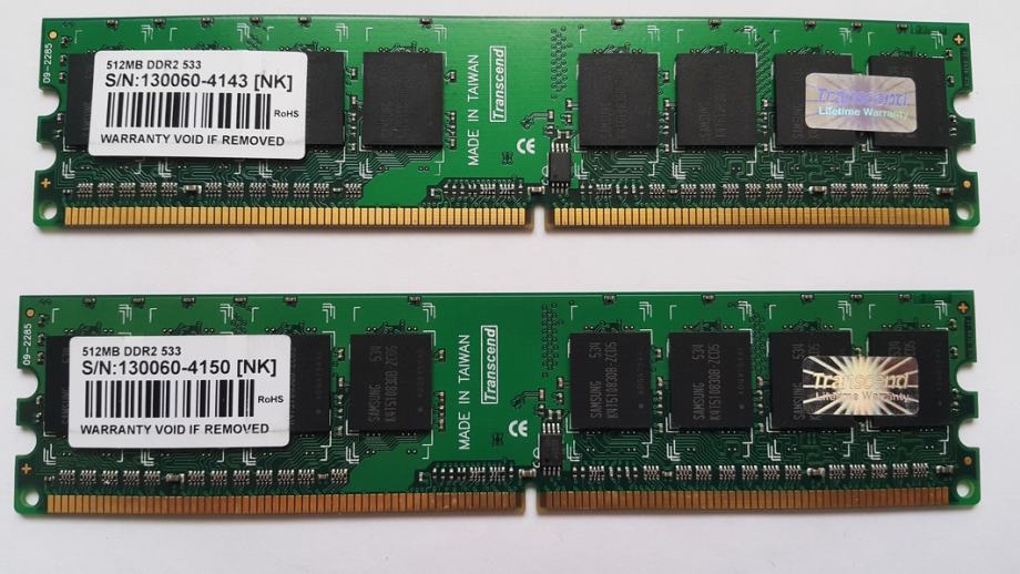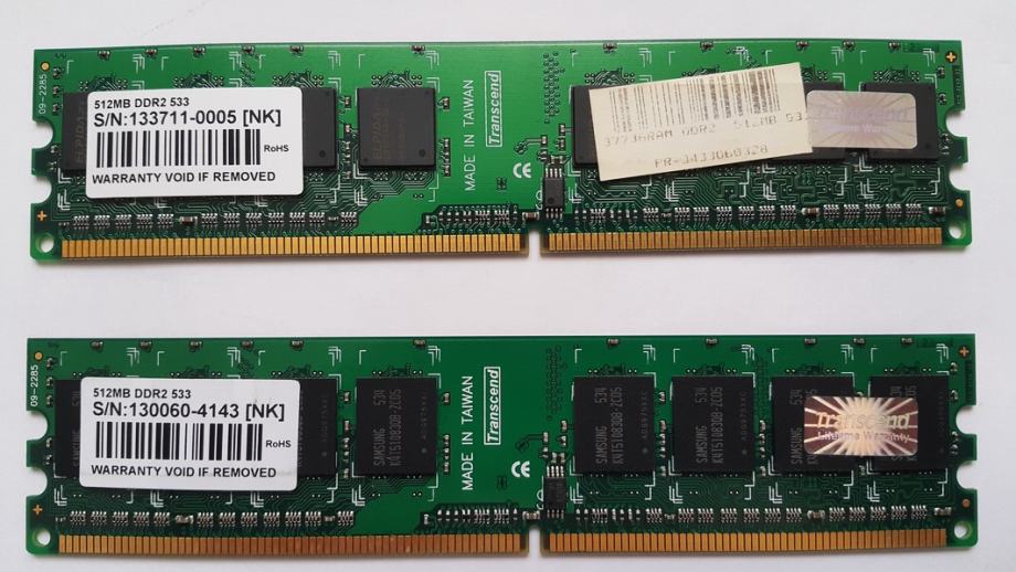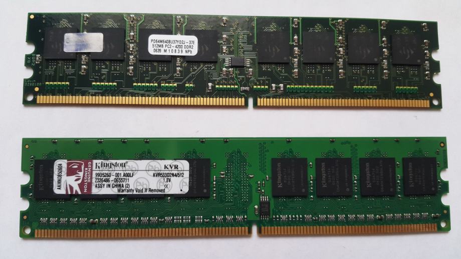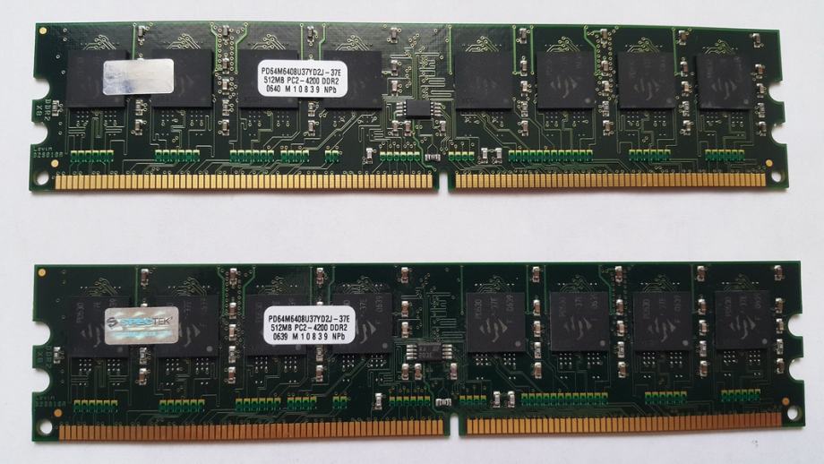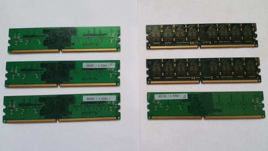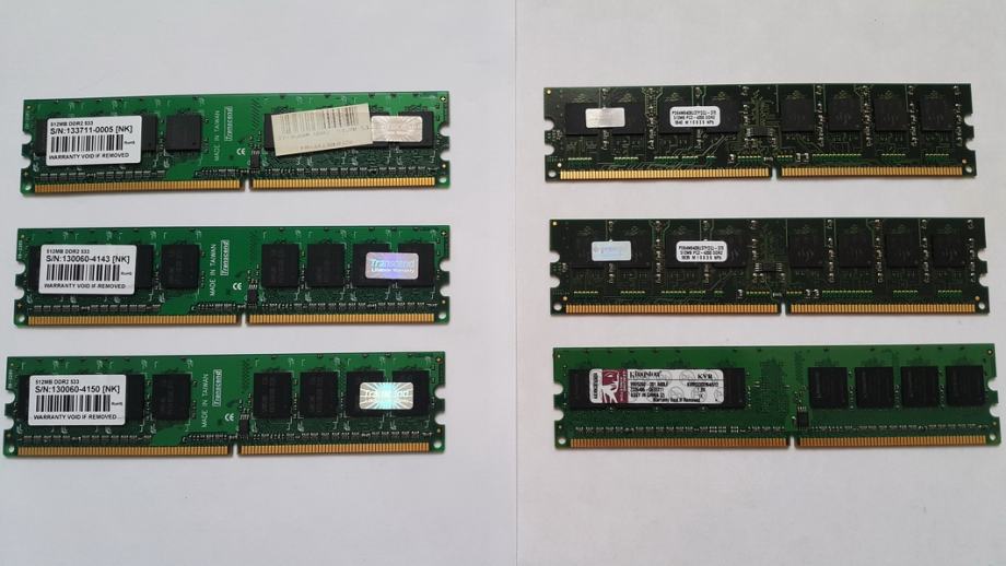Prodam 6x 512 MB PC4200 240-pin DDR2 UDIMM module za namizne računalnike, različnih modelov. Vsi 6 moduli naj bi veljali za delujoče, a kaer nimam več tako starejšega namiznega računalnika tega ne morem preveriti (z (npr.) MemTest86 4.3.7 programom, da bi res to preizkusil ali so dejansko brezhibni). Tako da se prodajajo načeloma kot delujoči, vendar pač vrnem denar, če se naknadno ugotovi, da niso.